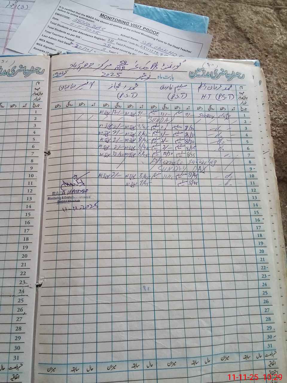 | Monitoring Date: 11-11-2025 | Start Time: 11-11-2025 10:06 AM | End Time: 11-11-2025 10:32 AM | Name of MEA: RA**** HA**** | |