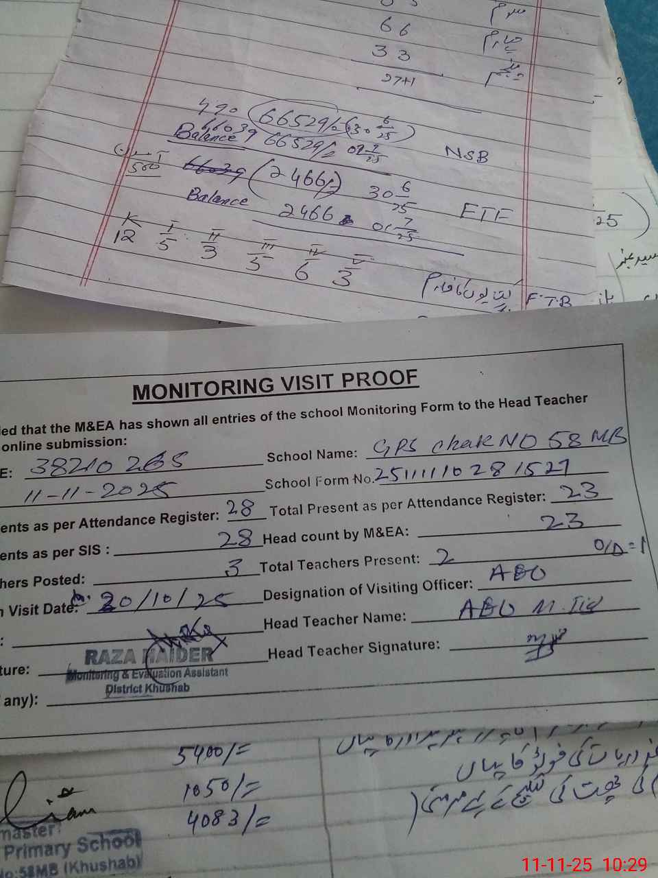 | Attendance Register | Head Teacher | MEA with School | Visit Proof |