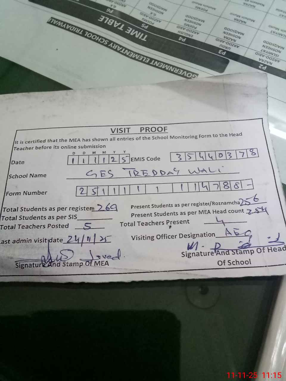 | Attendance Register | Head Teacher | MEA with School | Visit Proof |