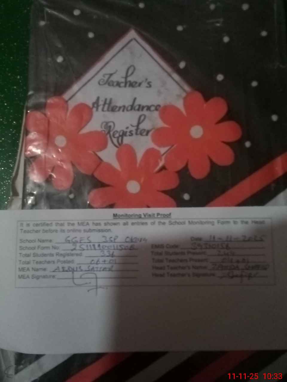 | Remarks (Use Separate Page if Required): Last administrator visit was carried out by AEO on 15 October 2025 Teacher Sadaf younus is absent since 7 November 2025 | |||||