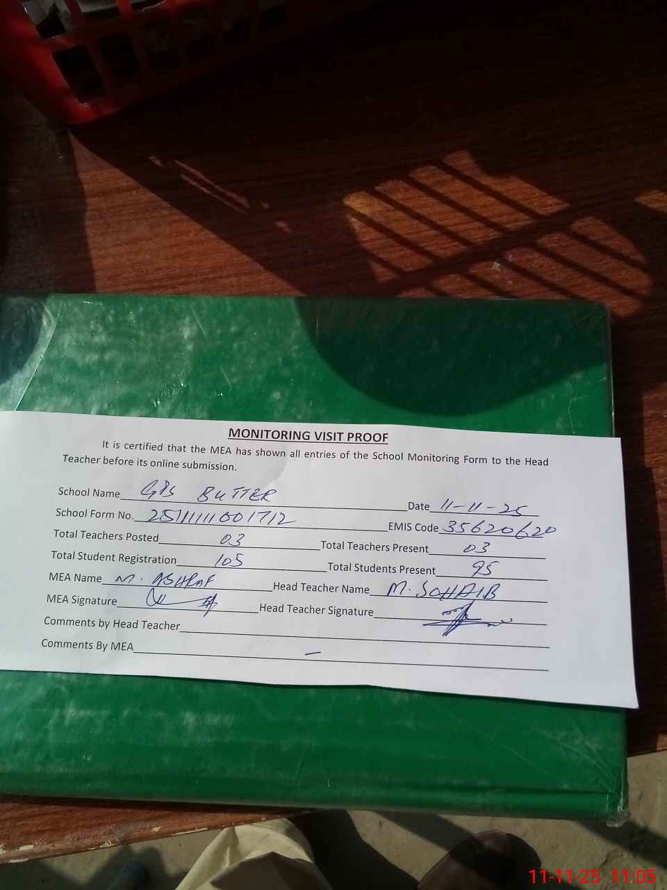 | Monitoring Date: 11-11-2025 | Start Time: 11-11-2025 10:45 AM | End Time: 11-11-2025 11:22 AM | Name of MEA: Mu**** As**** | |