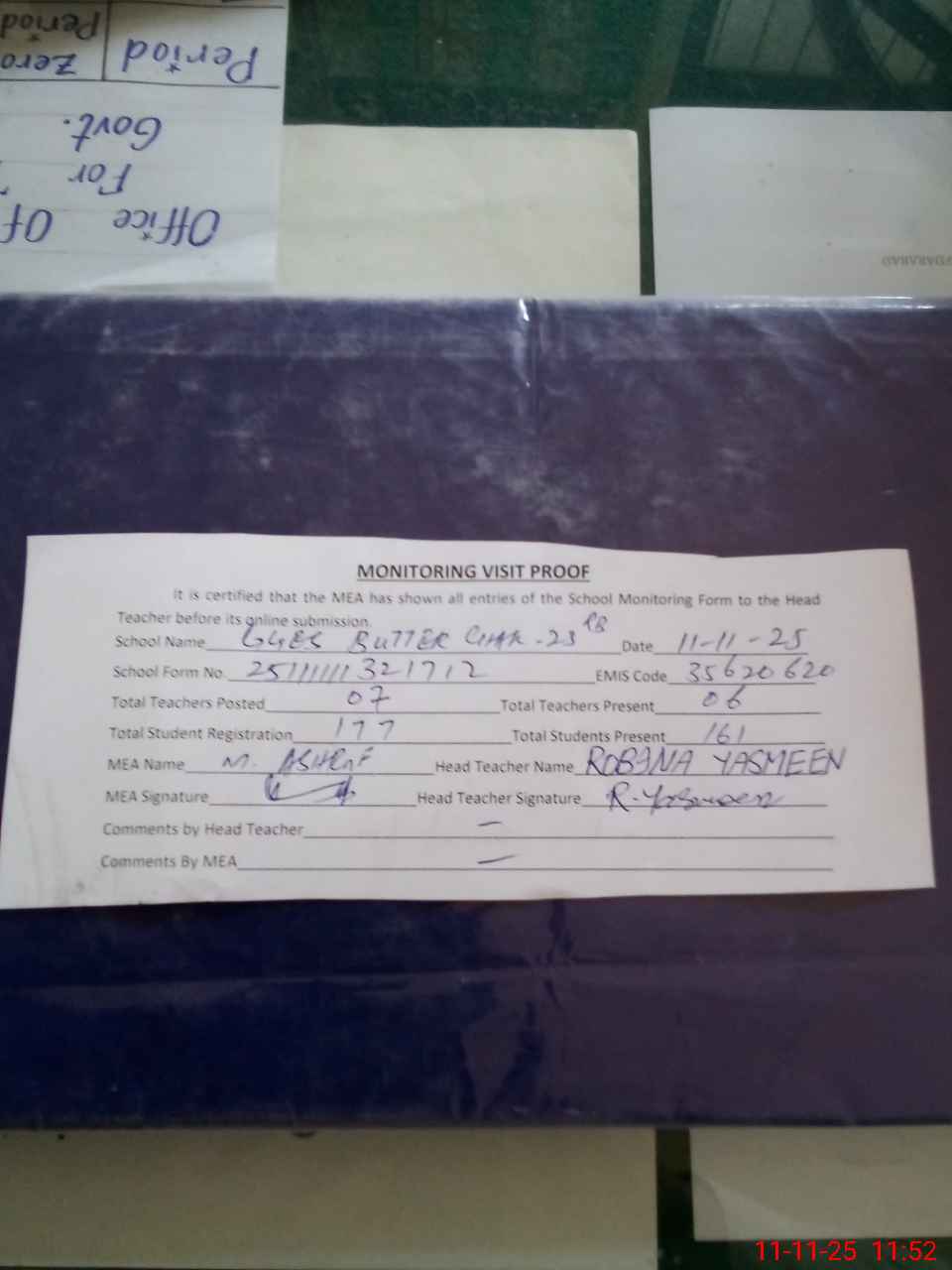 | Attendance Register | Head Teacher | MEA with School | Visit Proof |