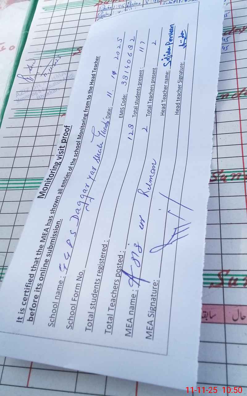 | Attendance Register | Head Teacher | MEA with School | Visit Proof |