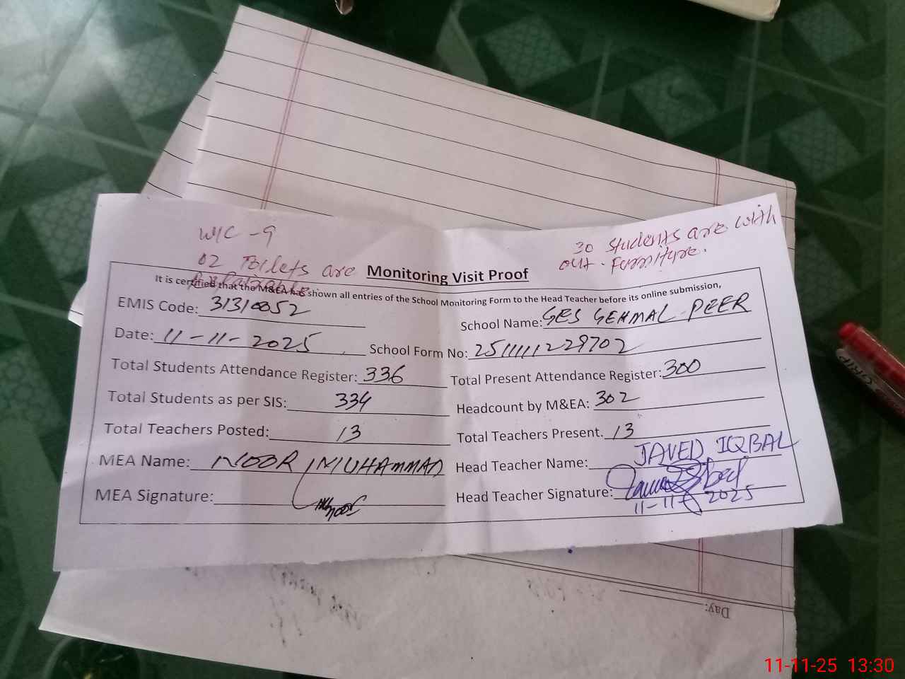 | EMIS Code: 31310052 | Name of School: GES GEHMAL PEER | |||