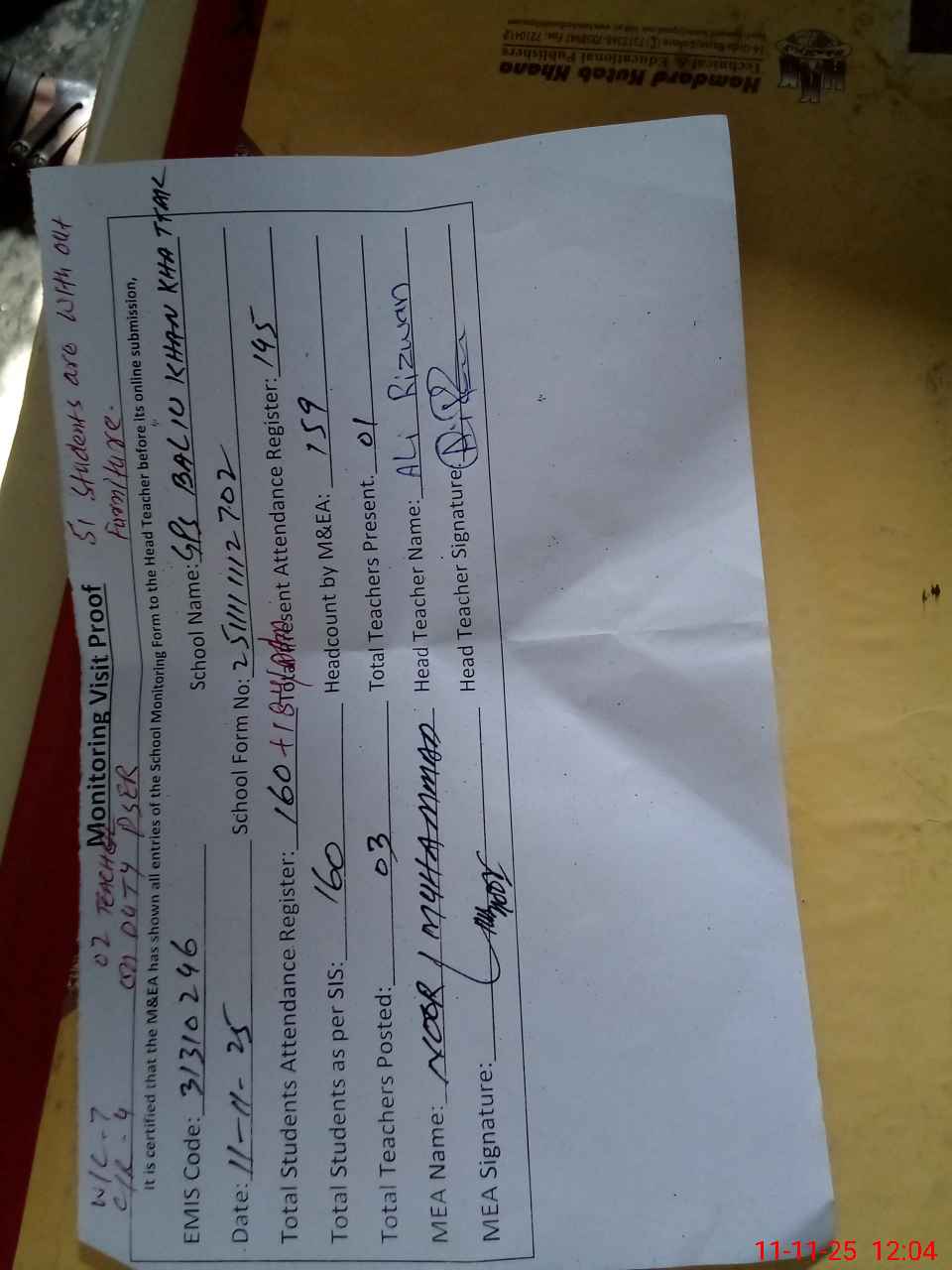 | Attendance Register | Head Teacher | MEA with School | Visit Proof |