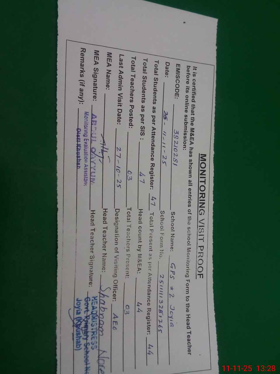 | EMIS Code: 38210281 | Name of School: GPS NO. 2 JOYIA | |||