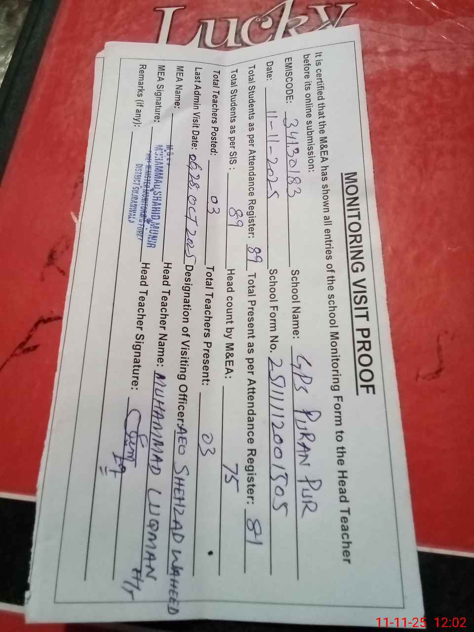 | Attendance Register | Head Teacher | MEA with School | Visit Proof |
