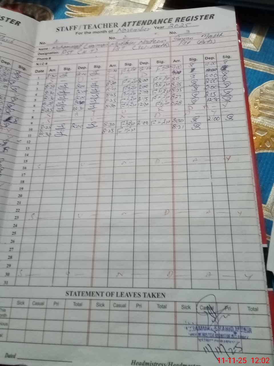 | CNIC | Full Name | Designation | R/C | Absence During Last Calender Month |