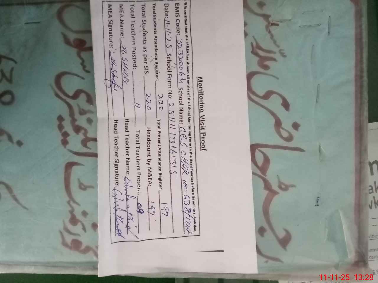 | Attendance Register | Head Teacher | MEA with School | Visit Proof |