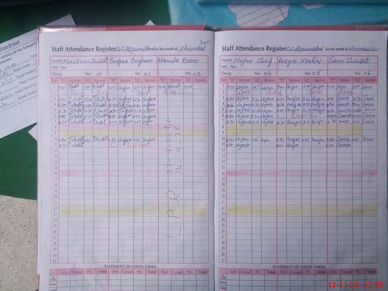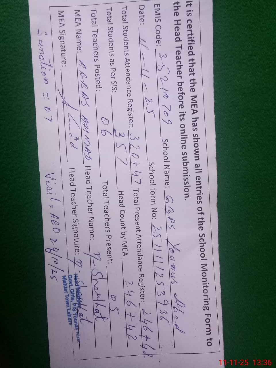| Attendance Register | Head Teacher | MEA with School | Visit Proof |