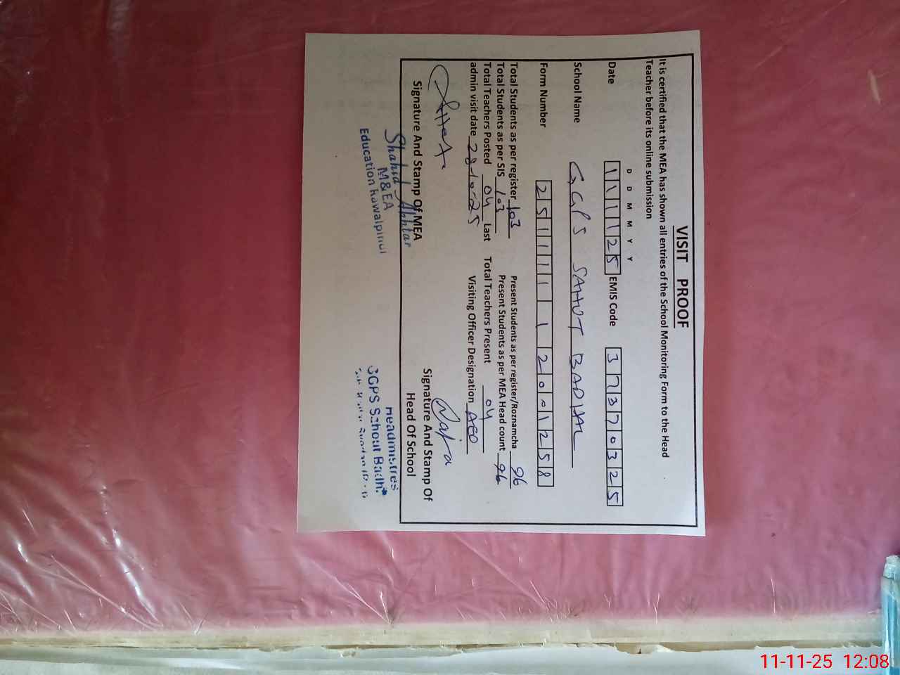 | Attendance Register | Head Teacher | MEA with School | Visit Proof |