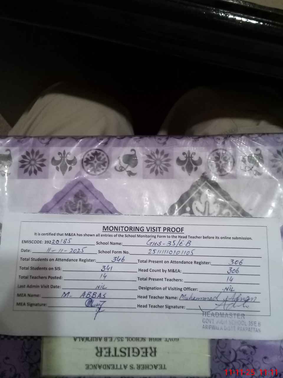 | Attendance Register | Head Teacher | MEA with School | Visit Proof |