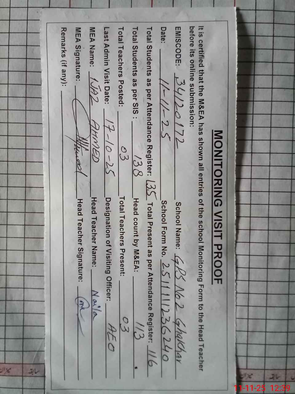 | Attendance Register | Head Teacher | MEA with School | Visit Proof |