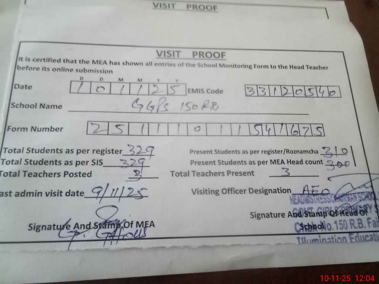 | Attendance Register | Head Teacher | MEA with School | Visit Proof |