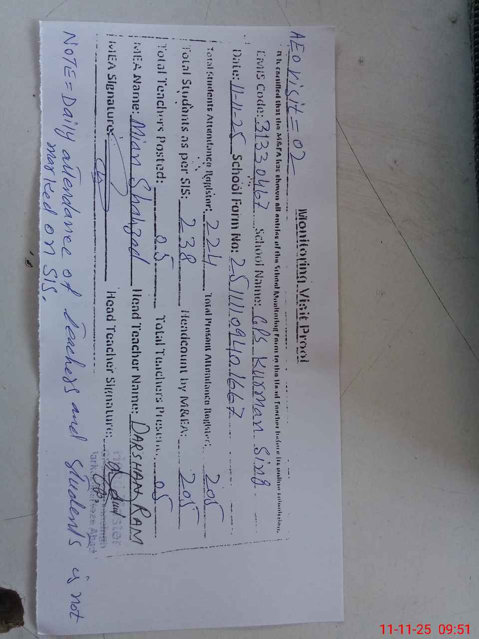 | Attendance Register | Head Teacher | MEA with School | Visit Proof |