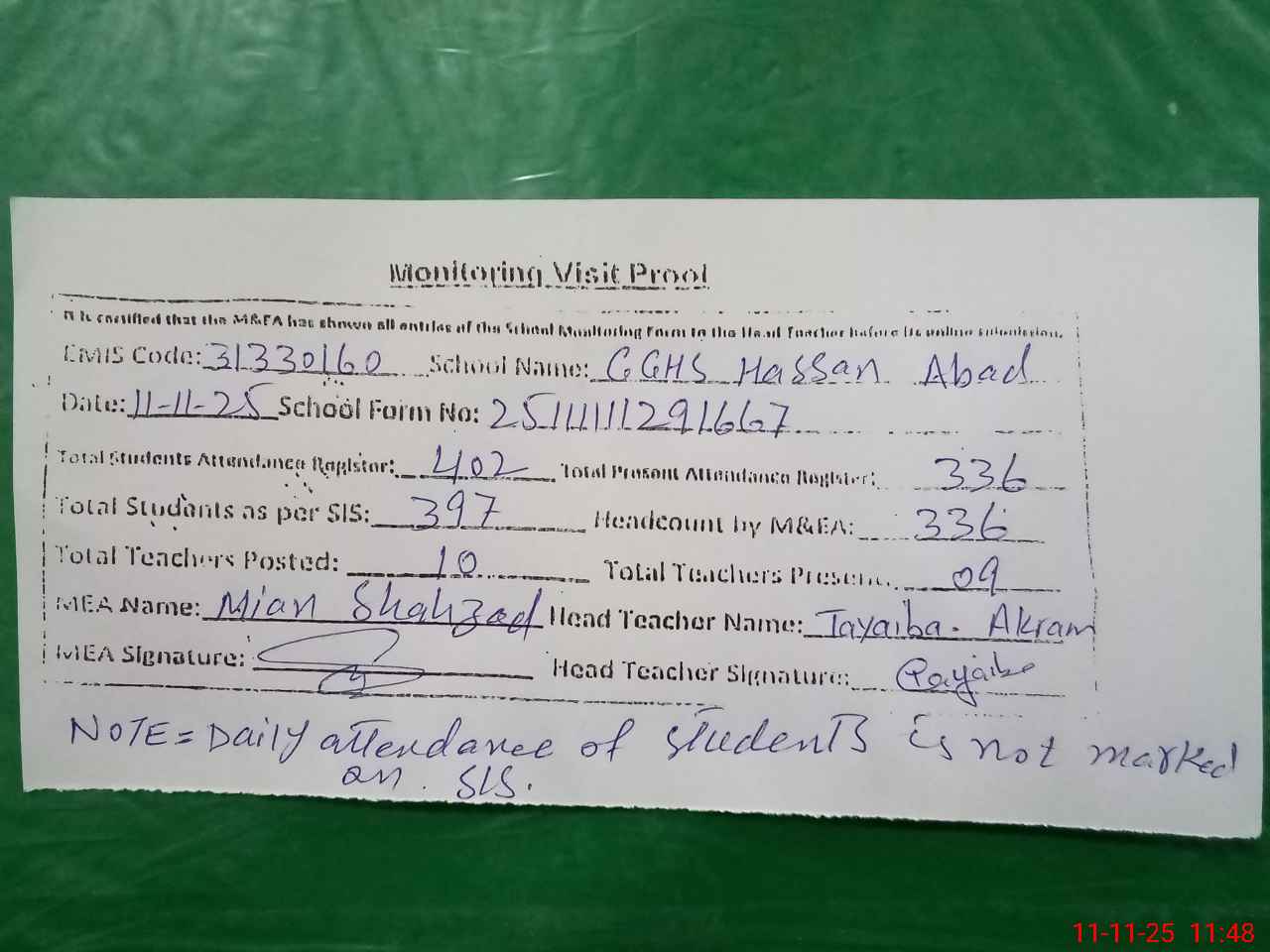 | Attendance Register | Head Teacher | MEA with School | Visit Proof |