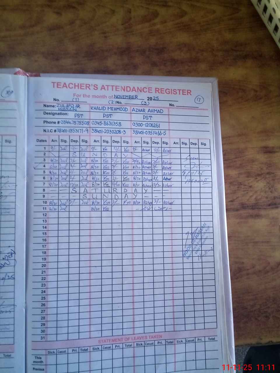 | CNIC | Full Name | Designation | R/C | Absence during last cal. month |