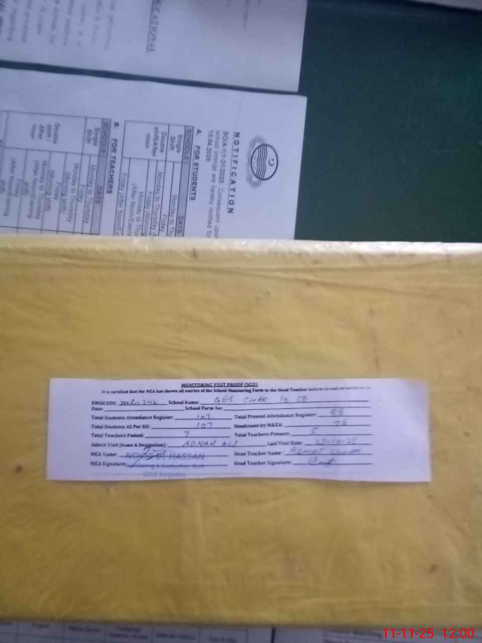 | Attendance Register | Head Teacher | MEA with School | Visit Proof |
