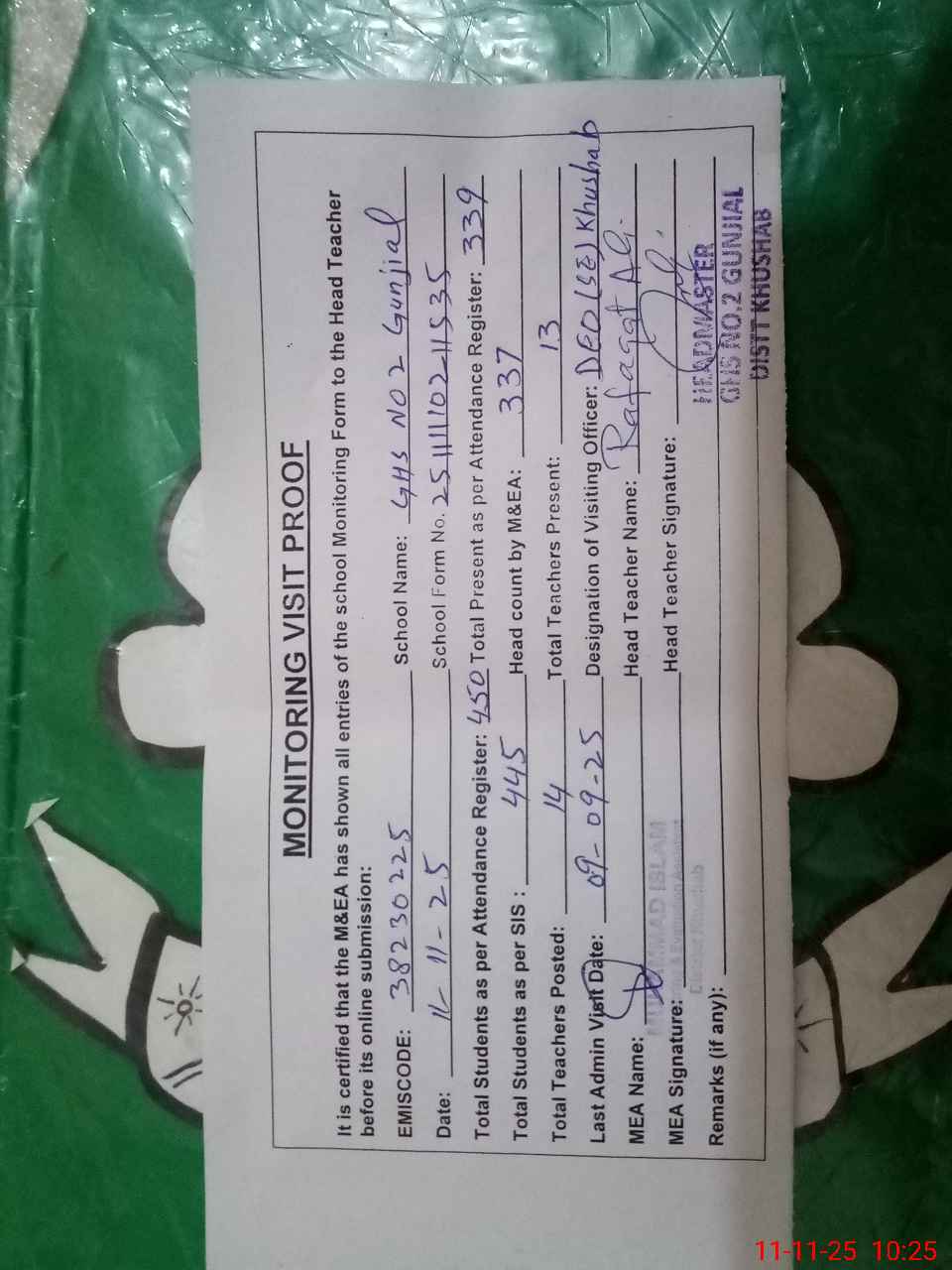 | Remarks (Use Separate Page if Required): DEO SE Khushab visited school on 9 September 2025 Students strength on sis 445 Students without furniture 6 class sitting on the floor 9 and 10 class sitting on benches but benches are not proper as per there age | |||||