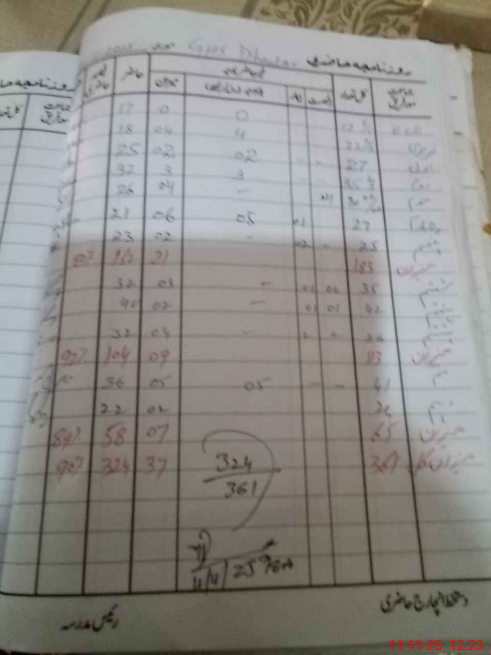| No. of Students Present - Male | 12 | 0 | 16 | 25 | 30 | 24 | 21 | 23 | 32 | 40 | 32 | 36 | 22 | 313 | ||