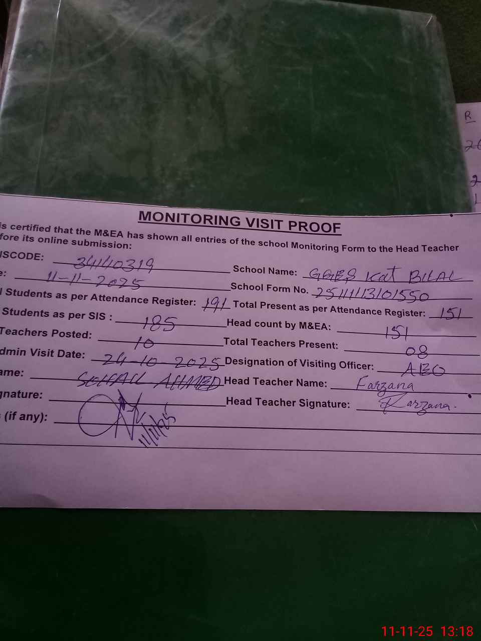 | Attendance Register | Head Teacher | MEA with School | Visit Proof |