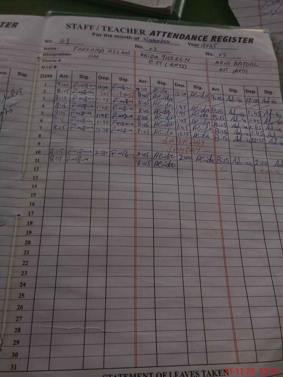 | CNIC | Full Name | Designation | R/C | Absence During Last Calender Month |