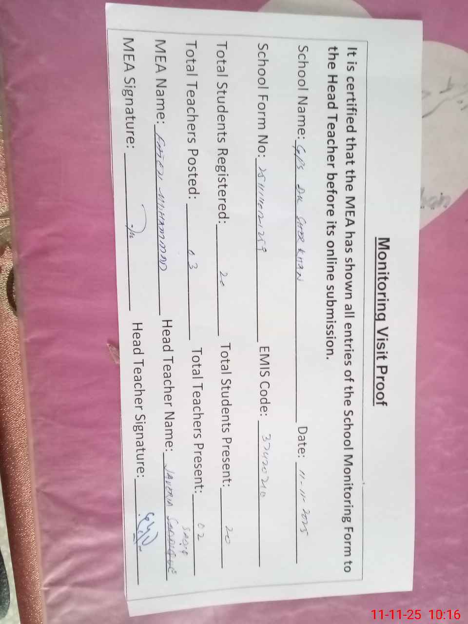 | Attendance Register | Head Teacher | MEA with School | Visit Proof |