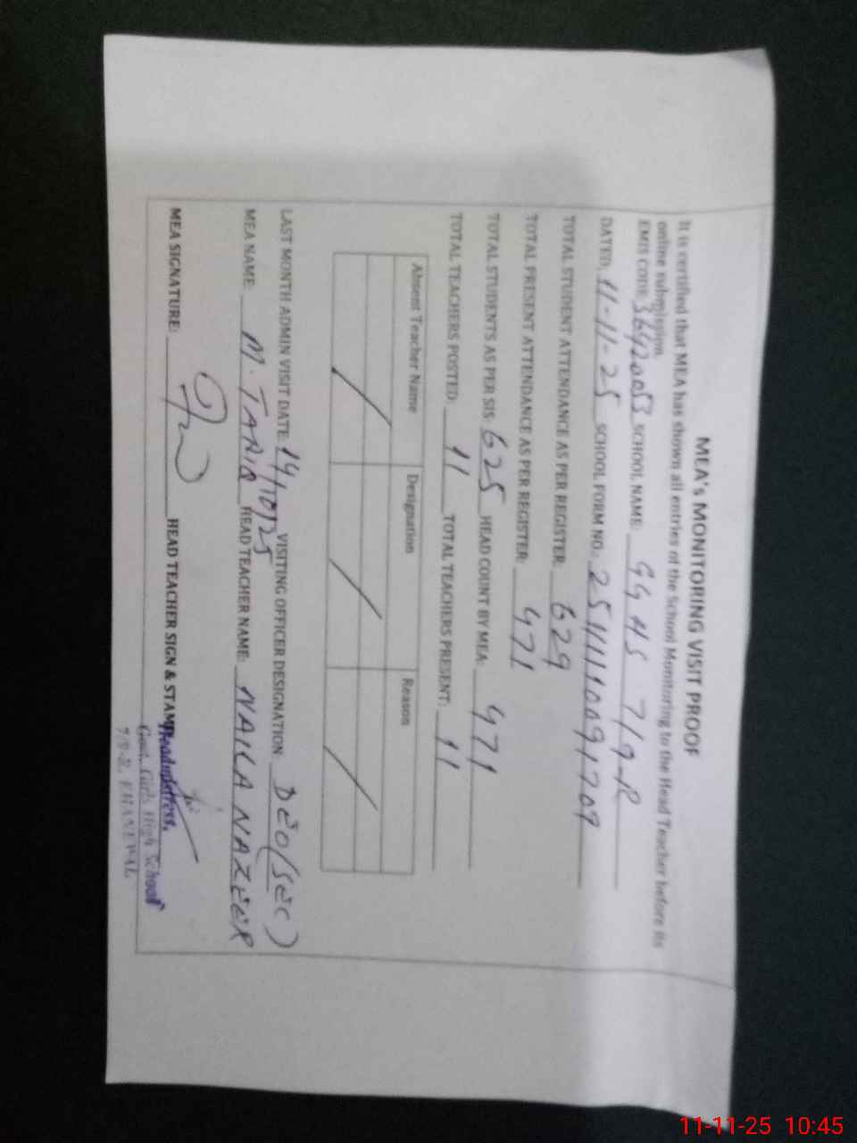 | Attendance Register | Head Teacher | MEA with School | Visit Proof |