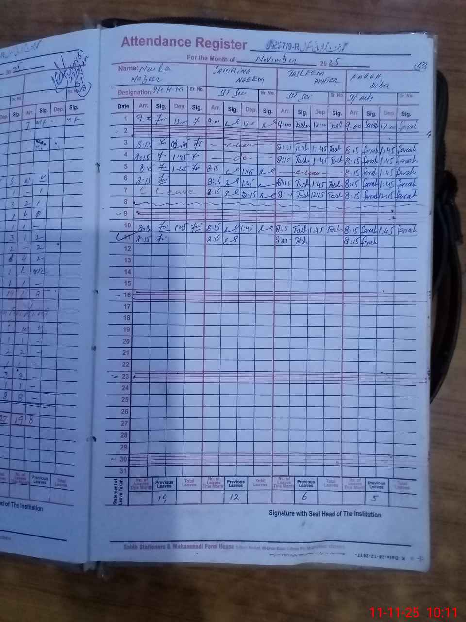 | CNIC | Full Name | Designation | R/C | Absence During Last Calender Month |