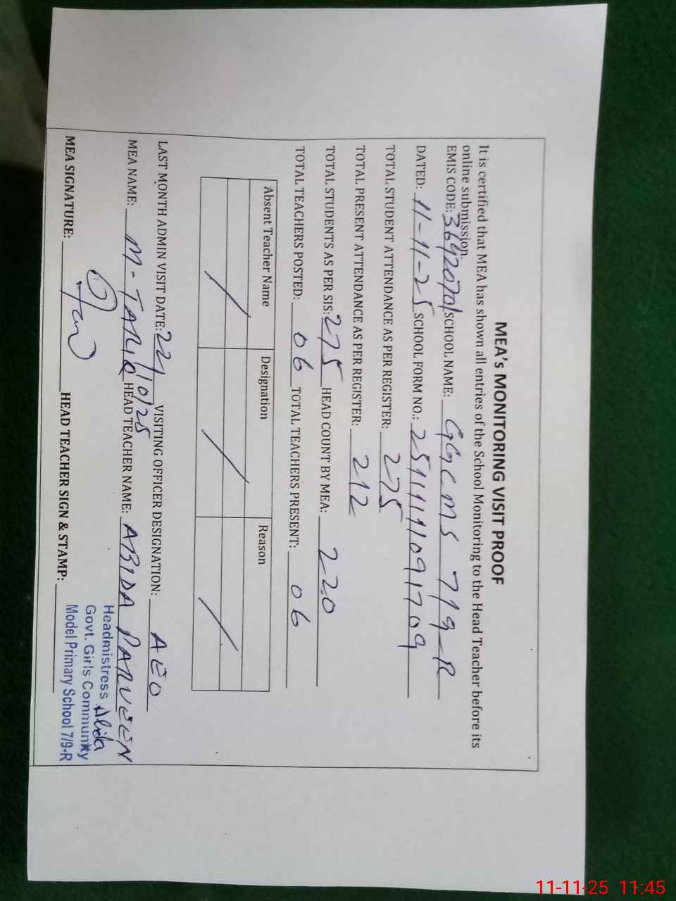 | Certified that this School was Inspected by the Undersigned MEA/DMO Today and the Information Stated Above is as Per Record. | |||||