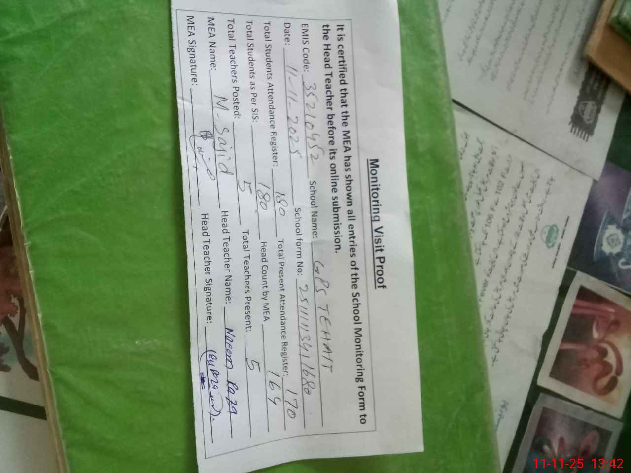 | Attendance Register | Head Teacher | MEA with School | Visit Proof |