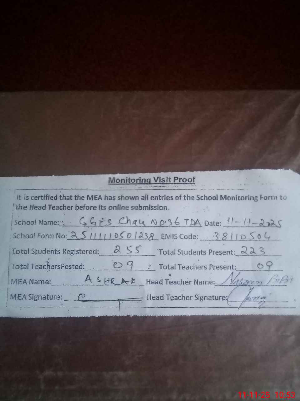 | Monitoring Date: 11-11-2025 | Start Time: 11-11-2025 10:15 AM | End Time: 11-11-2025 10:54 AM | Name of MEA: Mu**** As**** | |