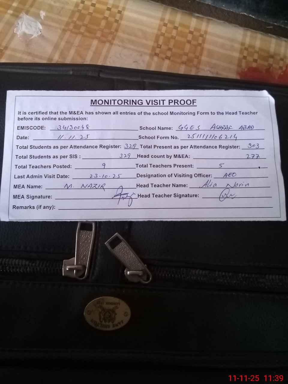 | Attendance Register | Head Teacher | MEA with School | Visit Proof |