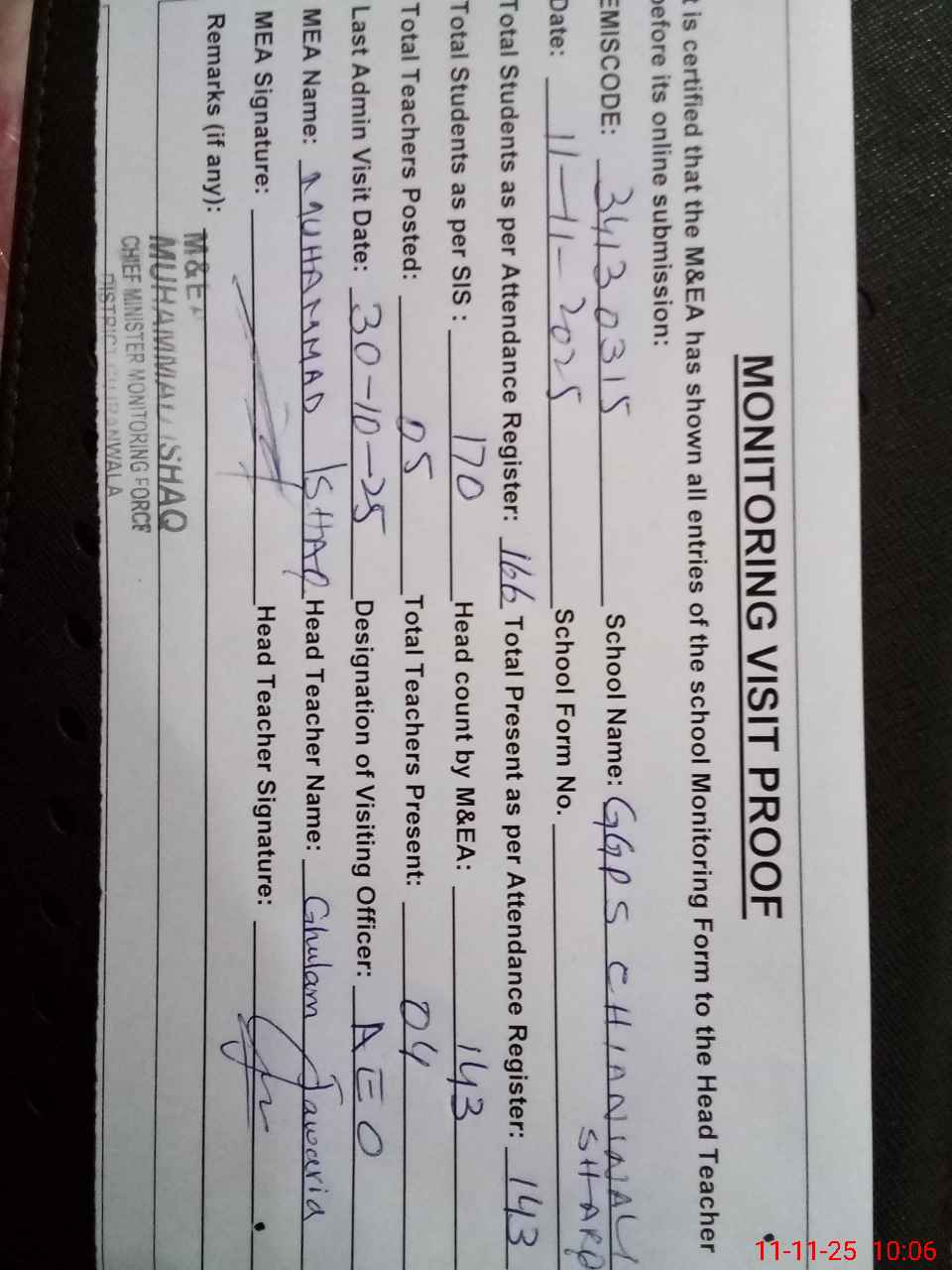 | EMIS Code: 34130315 | Name of School: GGPS CHIANWALI SHARQI | |||