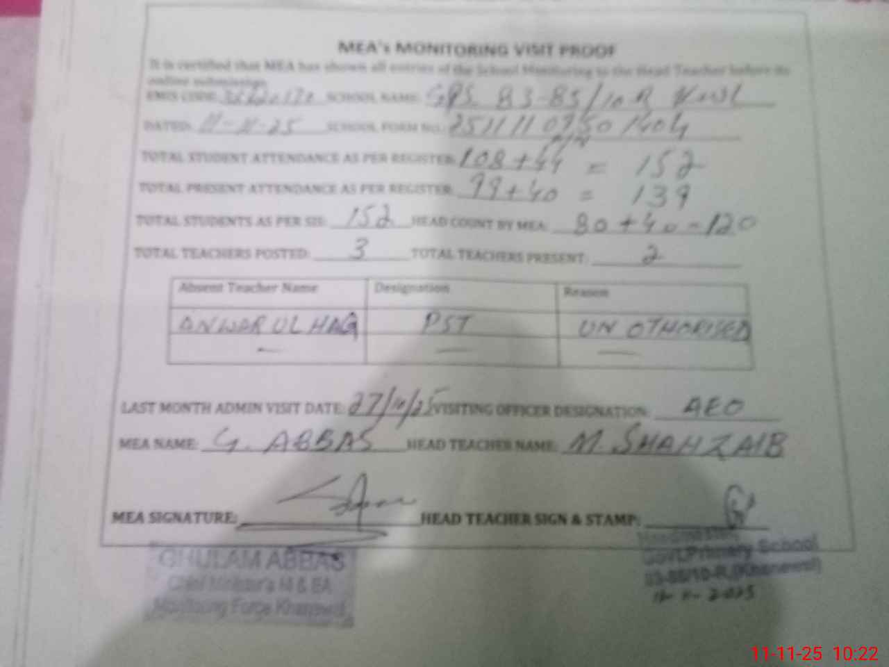| Attendance Register | Head Teacher | MEA with School | Visit Proof |