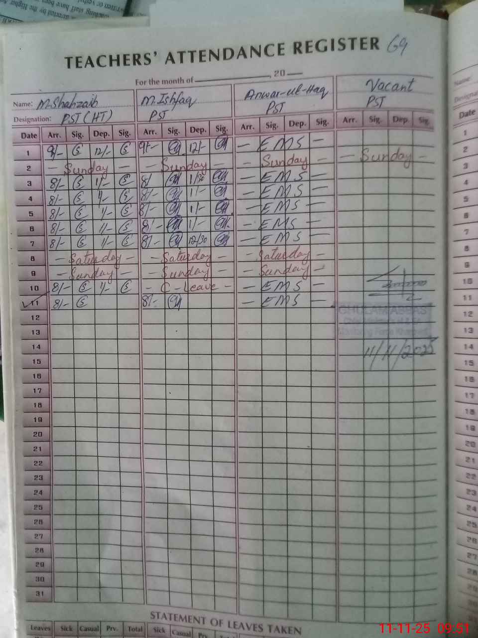| Leave | Duty | Absent | Maternity | Medical | Ex- Pak |
