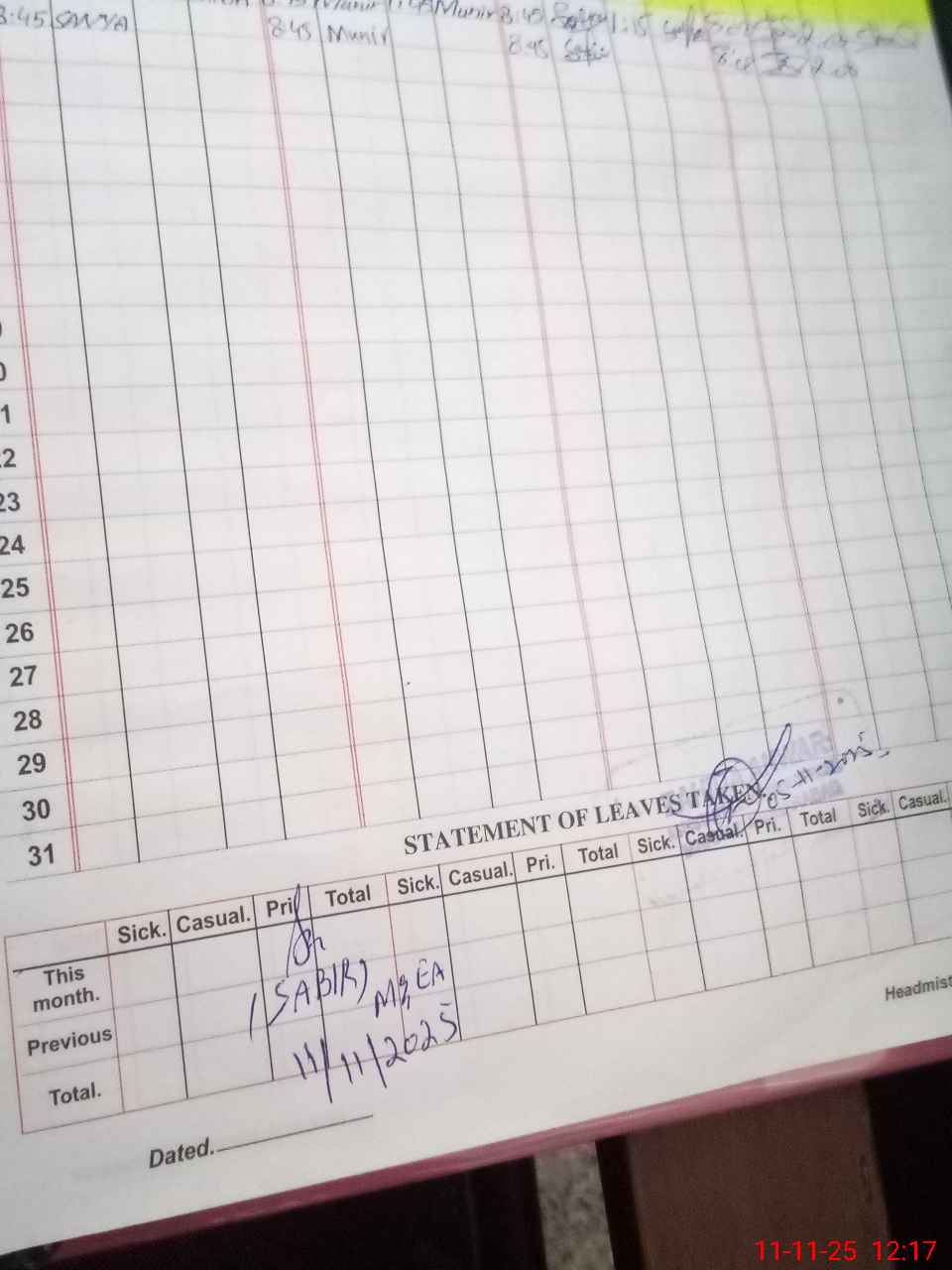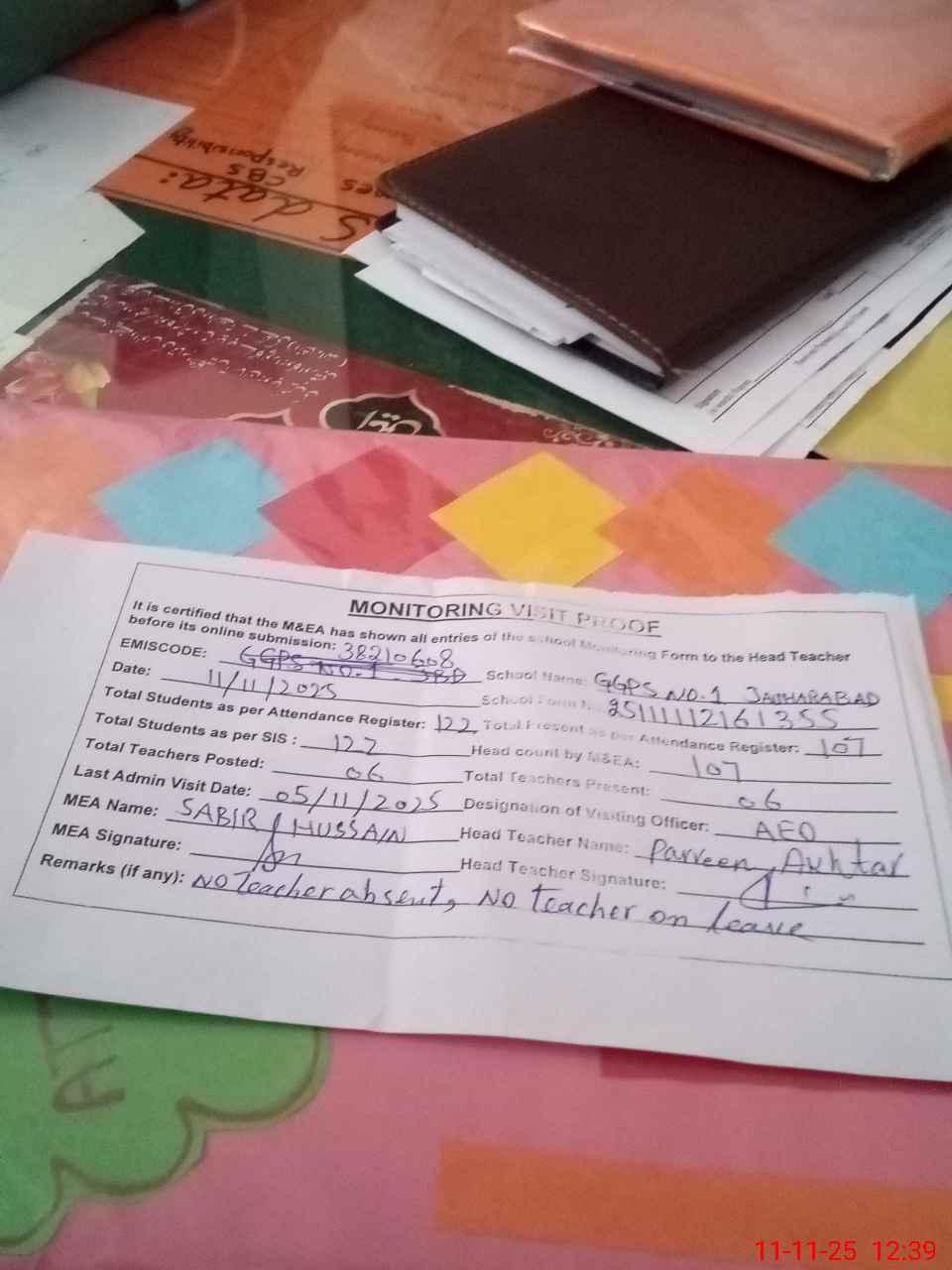 | Remarks (Use Separate Page if Required): No teacher absent No teacher on leave Last admin visit by AEO on 05 Nov 2025 | |||||
