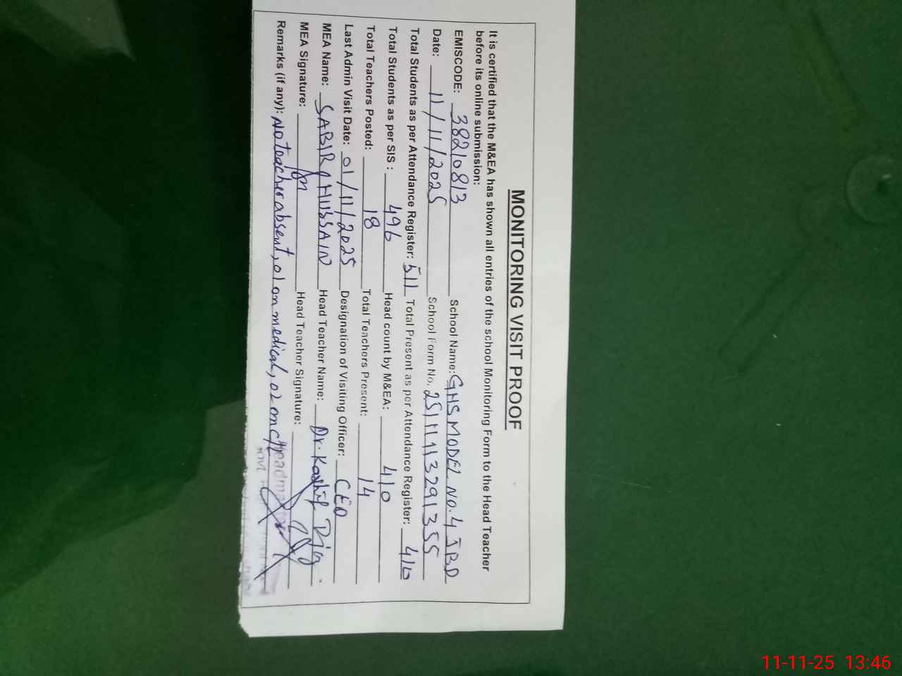 | Remarks (Use Separate Page if Required): No teacher absent 01 teacher on LPR 01 on medical leave 02 on casual leave 01 on PSER duty Last admin visit by | |||||