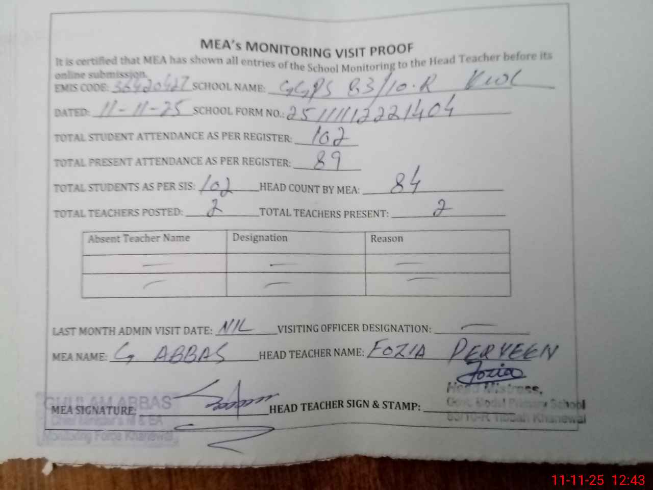 | Attendance Register | Head Teacher | MEA with School | Visit Proof |