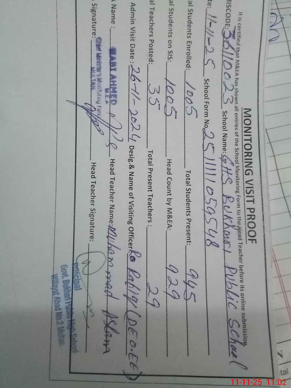 | EMIS Code: 36110023 | Name of School: GHS BUKHARI PUBLIC WILAYAT ABAD NO.2 MULTAN | |||