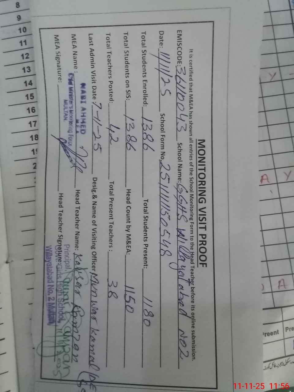 | EMIS Code: 36110043 | Name of School: GGHS WILLAYAT ABAD NO.2 MULTAN | |||