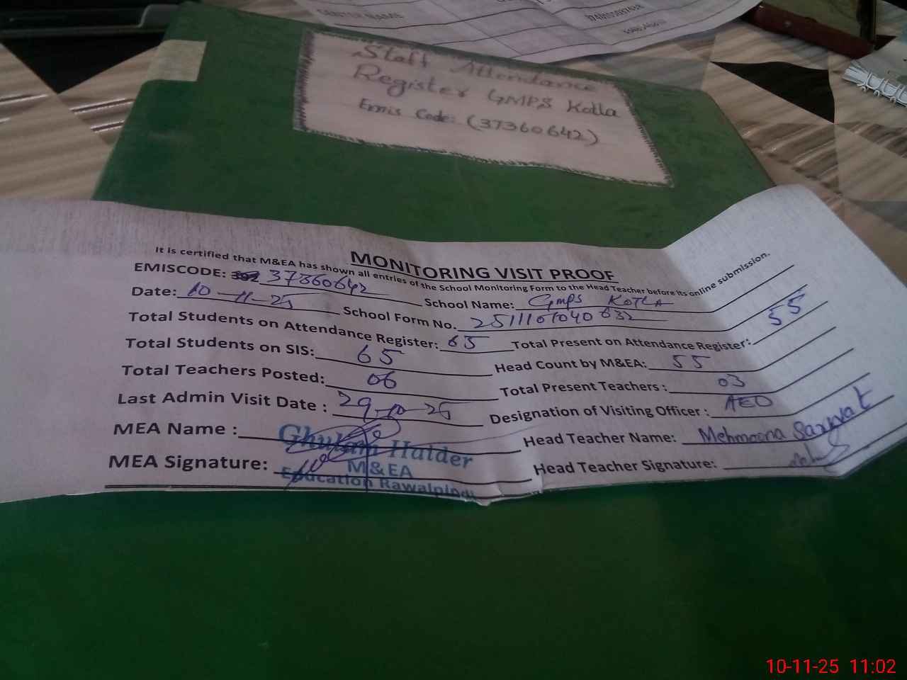 | Attendance Register | Head Teacher | MEA with School | Visit Proof |