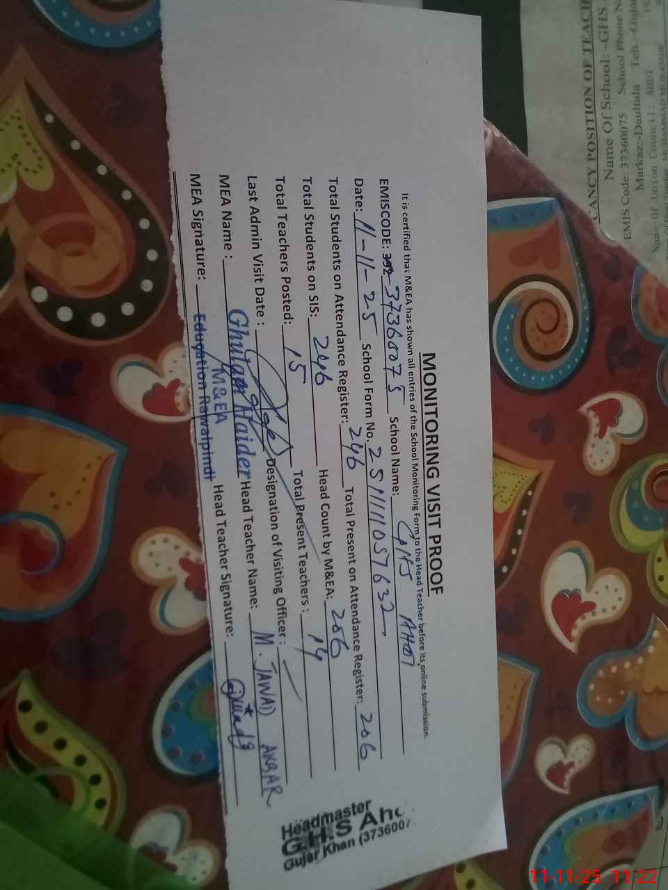 | Monitoring Date: 11-11-2025 | Start Time: 11-11-2025 10:39 AM | End Time: 11-11-2025 11:22 AM | Name of MEA: Gh**** Ha**** | |