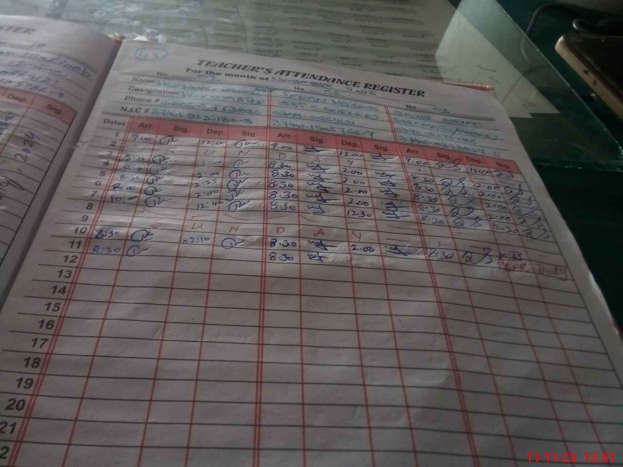 | CNIC | Full Name | Designation | R/C | Absence During Last Calender Month |