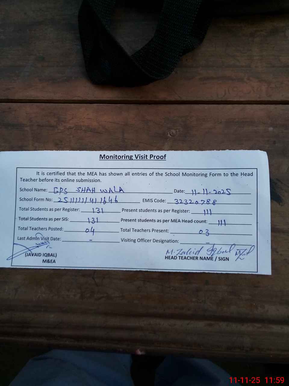 | Attendance Register | Head Teacher | MEA with School | Visit Proof |