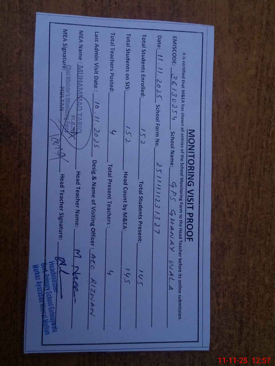 | Attendance Register | Head Teacher | MEA with School | Visit Proof |