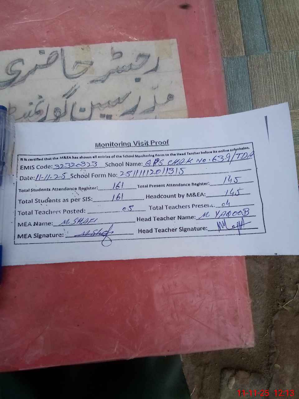 | Attendance Register | Head Teacher | MEA with School | Visit Proof |