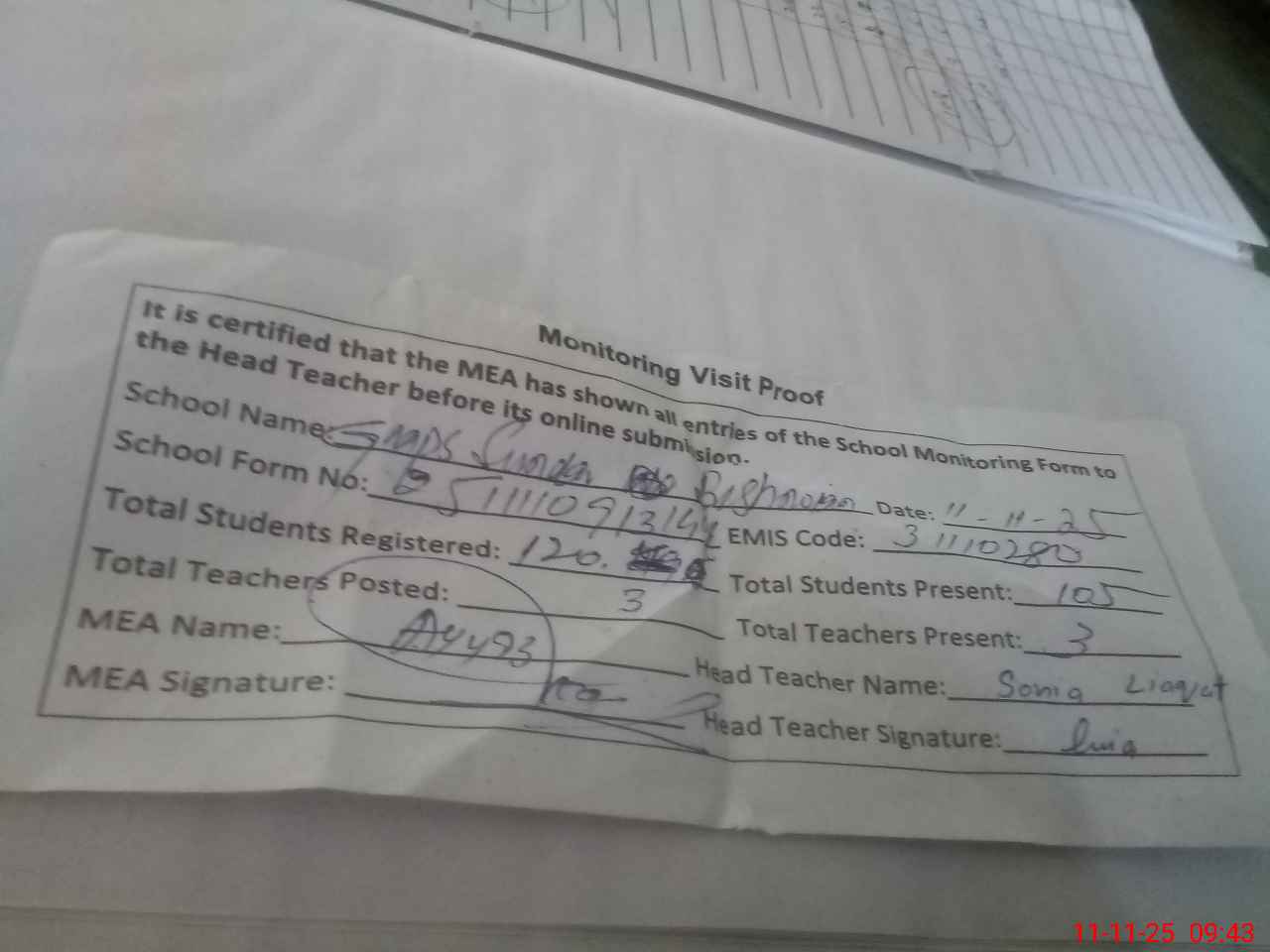 | Attendance Register | Head Teacher | MEA with School | Visit Proof |