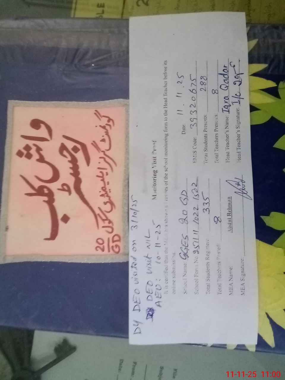 | Remarks (Use Separate Page if Required): There is no visit of DEO Dy DEO visited on 3 October 2025 AEO Visited on 10 November 2025 | |||||