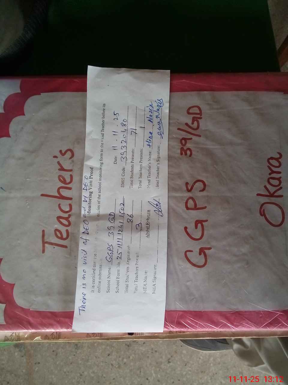 | Remarks (Use Separate Page if Required): There is no visit of DEO and Dy DEO AEO visited on 4 November 2025 | |||||